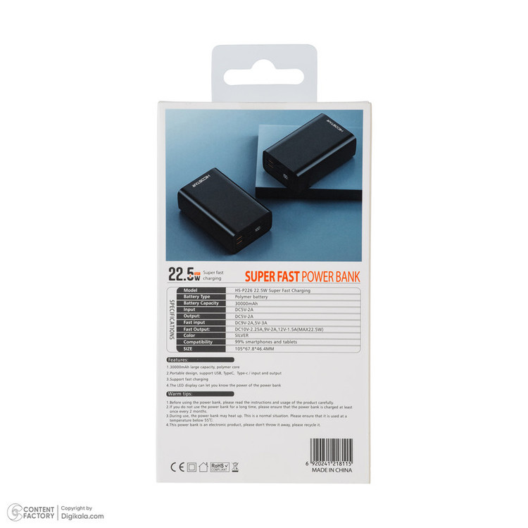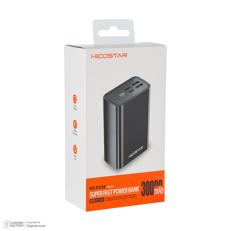 پاوربانک HICOSTAR مدل HS_P226 با ظرفیت ۳۰,۰۰۰ میلیآمپر ساعت، یک منبع انرژی قدرتمند و قابل اعتماد برای شارژ انواع دستگاههای هوشمند است. این مدل با پشتیبانی از فناوری شارژ سریع PD با توان ۲۲.۵ وات، قادر است دستگاههای شما را در کمترین زمان ممکن شارژ کند و تجربهای سریع و بیدردسر را رقم بزند. سیستم محافظت چندگانه (Multiple Protection Security System) امنیت کامل را در برابر مشکلاتی مانند اتصال کوتاه، نوسانات برق، افزایش دما و شارژ بیش از حد تضمین میکند، تا خیالتان از سلامت دستگاههای متصل به پاوربانک راحت باشد. طراحی ویژه پورتهای شارژ در این مدل، استفاده راحت و بهینه را فراهم کرده و ظاهر منحصر به فرد آن، علاوه بر کارایی بالا، زیبایی ظاهری را نیز به همراه دارد. با ظرفیت بسیار بالا، HS_P226 انتخابی عالی برای سفرهای طولانی، استفاده حرفهای و زمانی است که به منبع انرژی پرظرفیتی نیاز دارید.