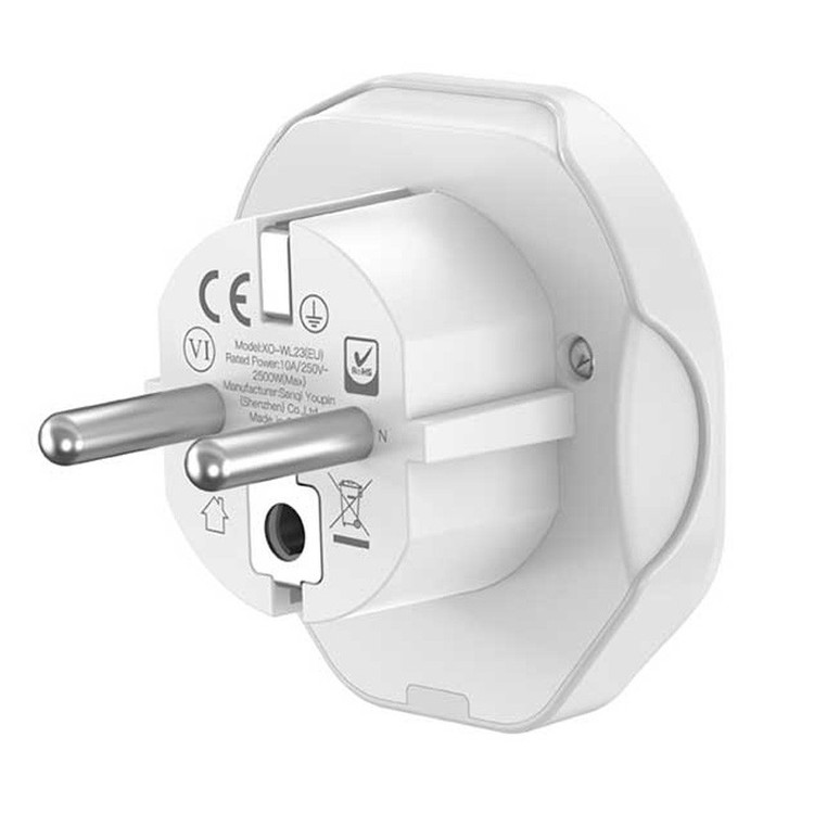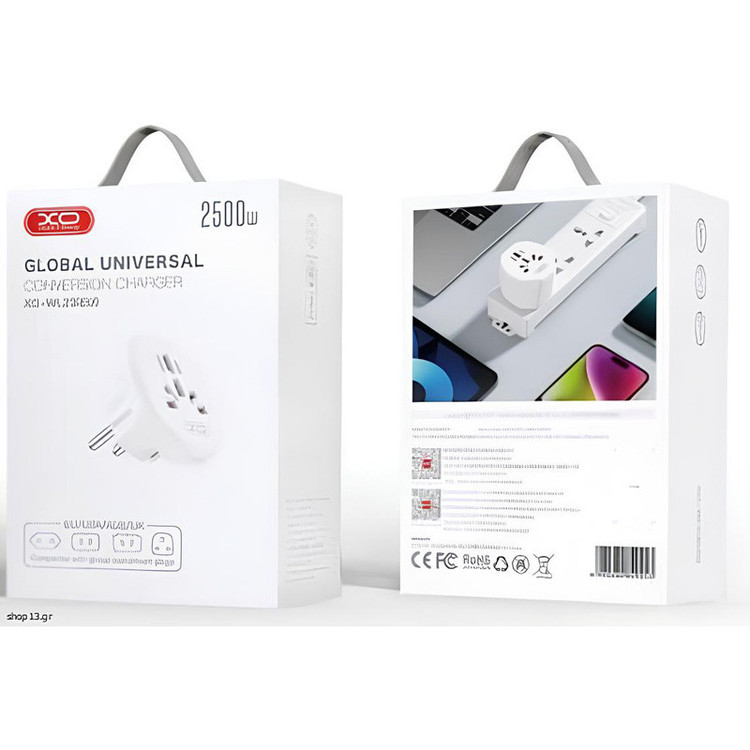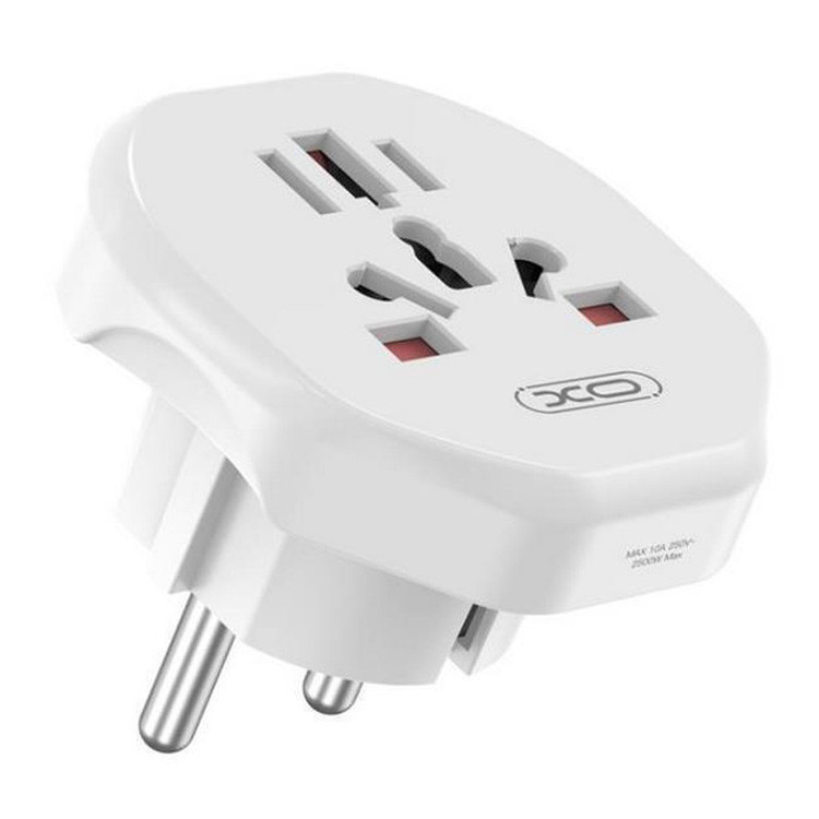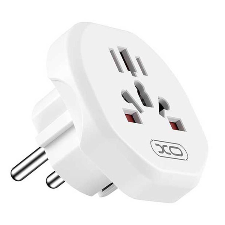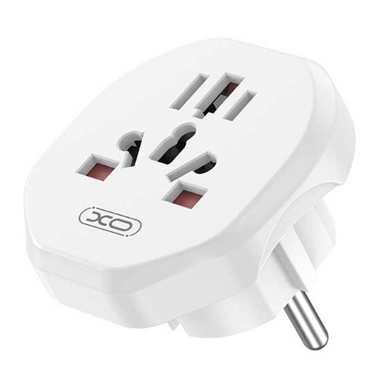 این مبدل XO دارای یک درشاخه با استاندار EU است.بدنه خارجی آداپتور مسافرتی جهانی WL23 برند ایکس او از پلی کربنات نسوز به رنگ سفید ساخته شده است .