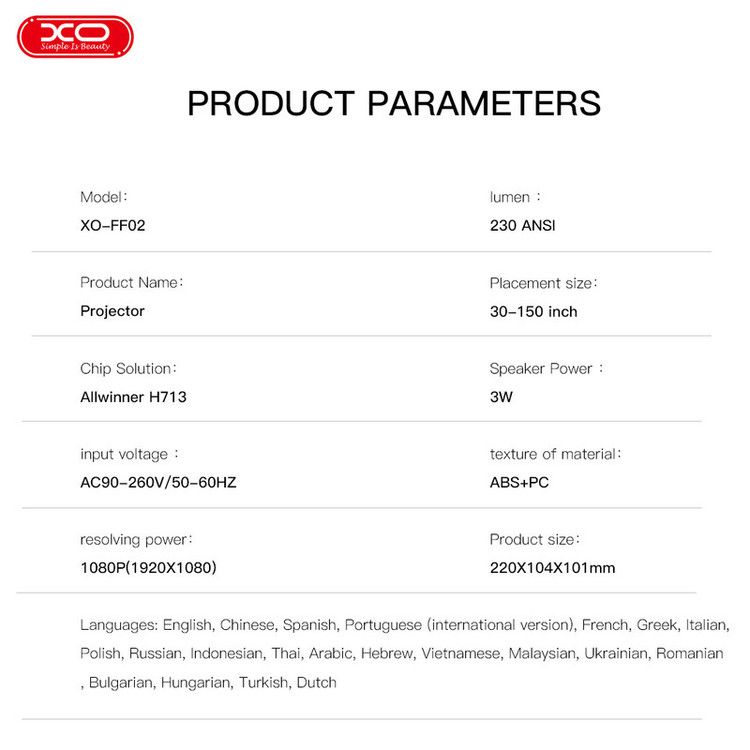پروژکتور XO FF02 دارای ویژگیهای متنوعی است که تجربه تماشای خانگی و حرفهای را ارتقا میدهد. این پروژکتور از وضوح Full HD 1080p بهره میبرد که تصاویر شفاف و با کیفیتی را ارائه میکند. روشنایی آن به 3000 لومن میرسد که باعث میشود حتی در محیطهای پرنور هم تصاویر به وضوح دیده شوند. تکنولوژی 3LCD که در این پروژکتور استفاده شده، رنگهای زنده و روشن را با تعادلی مطلوب بین نور سفید و رنگی نمایش میدهد. پشتیبانی از ویدیوهای 4K و HD,کیفیت تصویر 1080p HD,بلوتوث 5.0,زاویه چرخش 150 درجه, زاویه چرخش بالا,قابلیت تنظیم فوکوس از ویژگی های این دستگاه است.قابلیت پخش تصویر تا اندازه 300 اینچ (762 سانتیمتر) از دیگر امکانات برجسته XO FF02 است. همچنین این دستگاه دارای قابلیت اصلاح خودکار کیستون است که به کاربر کمک میکند تصویر را بهراحتی و بدون نیاز به تنظیمات پیچیده روی دیوار تنظیم کند. دانگل Android TV و قابلیت Chromecast داخلی نیز امکان پخش مستقیم محتوا از سرویسهای استریمینگ مانند نتفلیکس و یوتیوب را فراهم میکند.از دیگر ویژگیها میتوان به بلندگوی 5 واتی داخلی، پورت HDMI برای اتصال به دستگاههای خارجی و طراحی جمع و جور و سبک اشاره کرد که حمل و جابجایی آن را ساده میکند.