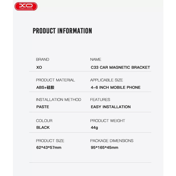 پایه نگهدارنده گوشی ایکس او XO-C33 Car Magnetic Bracket: هولدرها با قرار دارد گوشی در زاویه دید راننده کمک میکنند تا راننده بتواند در کمال آرامش و بدون اینکه حواسش از جاده پرت شود با گوشی مسیر یابی کند. کمپانی ایکس او محصولی به نام هولدر گوشی XO C33 Magnetic Car Holder را تولید کرده است که مناسب نصب روی داشبورد بوده و امکان یک رانندگی امن را برای شما فراهم میکند. هولدر کوچک و مغناطیسی: ابعاد هولدر مگنتی ایکس او C33 برابر با 57×43×62 میلی متر است و وزنش 44 گرم میباشد. بدنه از پلاستیک ABS و در بعضی بخش ها از سیلیکون ساخته شده و بسیار کارآمد است. صفحه ای که گوشی روی آن نصب میشود دارای آهنربا میباشد تا به خوبی گوشی را در جاده و دست اندازها نگه دارد. یک چسب محکم به انتهای این استند متصل است که اجازه میدهد هر زمانی که خواستید استند را از روی داشبورد برداشته و جای دلخواه دیگری قرار دهید. سازگار با گوشی های 4 تا 6 اینچ: قسمت مگنتی هولدر ایکس او به صورت یک صفحه شیاردار با پوشش تقریبا نرم است. این پوشش سیلیکونی باعث شده تا با وجود قدرت مگنتی بالای هولدر، در محل تماس با گوشی موبایل هیچ آسیب و خط و خشی به آن وارد نشود. شما میتوانید همه گوشی های دارای ابعاد 4 تا 6 اینچ را روی این هولدر نصب کنید. رانندگی ایمن با چرخش 360 درجه: این هولدر مغناطیسی به وسیله یک مفصل توپی به پایه متصل میشود و میتواند به صورت 360 درجه بچرخد. بدین صورت راننده میتواند گوشی را در هر زاویه ای که بخواهد تنظیم کند و در حین رانندگی حواسش پرت نخواهد شد.