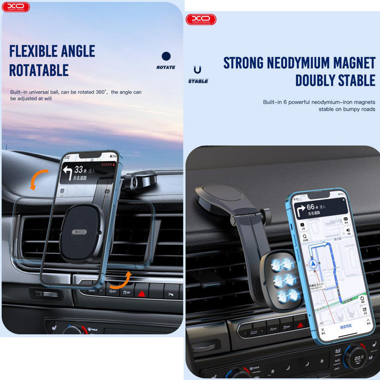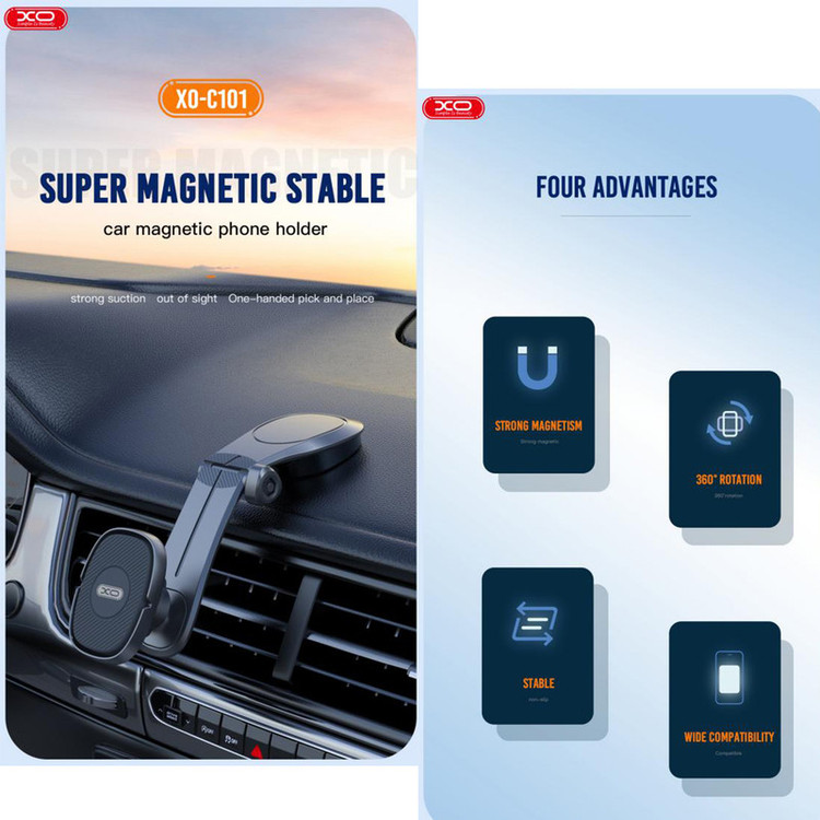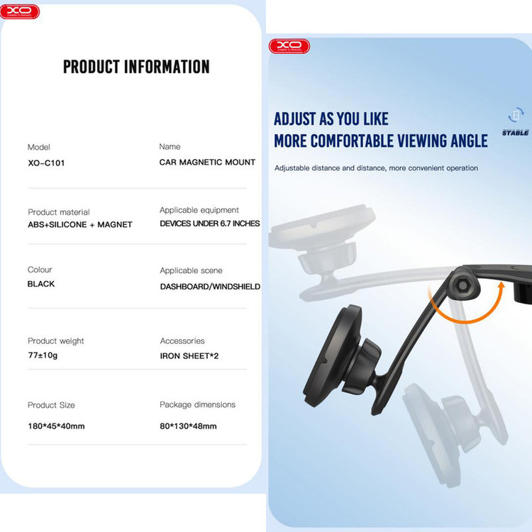پایه نگهدارنده موبایل ایکس او XO C101 Magnetic Suction Car Phone Holder هولدر XO C101 یک هولدر از نوع داشبوردی با بازوی قابل تنظیم و مگنتی می باشد. هولدر در ماشین نیاز بسیاری از کاربران بوده که با استفاده از آن می توانند به راحتی به گوشی موبایل خود دسترسی داشته و کنترل موزیک، نقشه، و ... را در اختیار داشته باشید. مشخصات هولدر XO C101 هولدر XO C101 به گونهای طراحی شده است که میتوانید آن را در قسمتهای مختلف داشبورد ماشین نصب کنید. این هولدر از 6 آهنربای قدرتمند تشکیل شده که قادر است دستگاه متصل به خود را به خوبی در هر شرایطی با ثبات بالا نگهدارد. سری این محصول دارای مفصل توپی بوده که قابلیت چرخش 360 درجه به طرفین به شما می دهد؛ و می توانید گوشی خود را به صورت افقی و عمودی استفاده کنید. بازوی هولدر موبایل ایکس او C101 قابل تنظیم بوده و شما طبق نیازتان می توانید آن را به سمت بالا و پایین تنظیم کنید. این هولدر بعد از نصب، به خوبی گوشی را نگه می دارد و شما می توانید به راحتی با گوشی خود کار کرده و یا حتی گوشی موبایلتان را به شارژ متصل کنید. هولدر موبایل ایکس او C101 از پلاستیک محکم ABS و سیلیکون ساخته شده که مقاومت بالایی خواهد داشت ودارای ابعاد 180x45x40 میلی متر و وزن حدودی 77 گرمی می باشد. سازگاری هولدر XO C101 با تمام گوشی های زیر 6.7 اینچی سازگار بوده و می تواند گوشی شما را به خوبی نگه دارد.