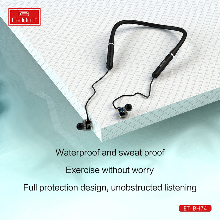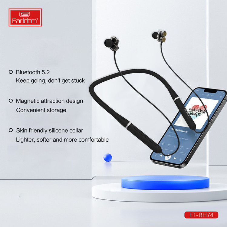 هندزفری های دورگردنی به دلیل راحتی در حمل و زیبایی، محبوبیت بسیاری در سرتاسر دنیا پیدا کرده اند، از این رو کمپانی ارلدام نیز از رقبا عقب نمانده و هندزفری بلوتوثی دورگردنی خود را با عنوان earldom BH74 عرضه کرد. این هندزفری از طریق بلوتوث نسخه 5 به تلفن همراهتان متصل شده و تا برد 10 متر اتصالی بدون نویز و قطعی را برایتان تضمین می کند. قسمت روی گردنی این هندزفری سیلیکونی می باشد و کاملا قابل انعطاف هست و همچنین وجود 4 عدد بلندگو ( در هر سمت 2 عدد ) باعث می شود که هندزفری یکی از حرفه ای ترین هندزفری های بازار برای گوش دادن به موسیقی تبدیل شود ،بر روی این هندرفری کلید های مدیریتی تعبیه شده که به وسیله آن می توان فعالیت های در حال انجام مانند مدیریت تماس، مدیریت موسیقی، کم و زیاد کردن صدا و فراخوانی دستیارهای صوتی اپل یا گوگل را کنترل کرد. میکروفون تعبیه شده در BH74 می تواند صدای کاربر را با کیفیت HD منتقل کند.باتری تعبیه شده در BH74 نیز توسط یک کابل Micro USB در مدت زمان 1 الی 2 ساعت به صورت کامل شارژ می شود و پس از آن به طور تقریبی می تواند حدود 22 الی 24 ساعت به پخش موسیقی یا مکالمه بپردازد . از آن جایی که هندزفری های پشت گردنی محبوبیت بسیاری بین ورزشکاران پیدا کرده ، این هندزفری طوری طراحی شده تا در برابر رطوبت و عرق کردن کاملا مقاوم باشد .