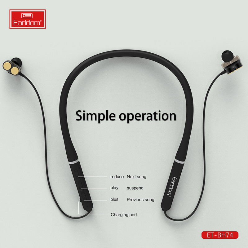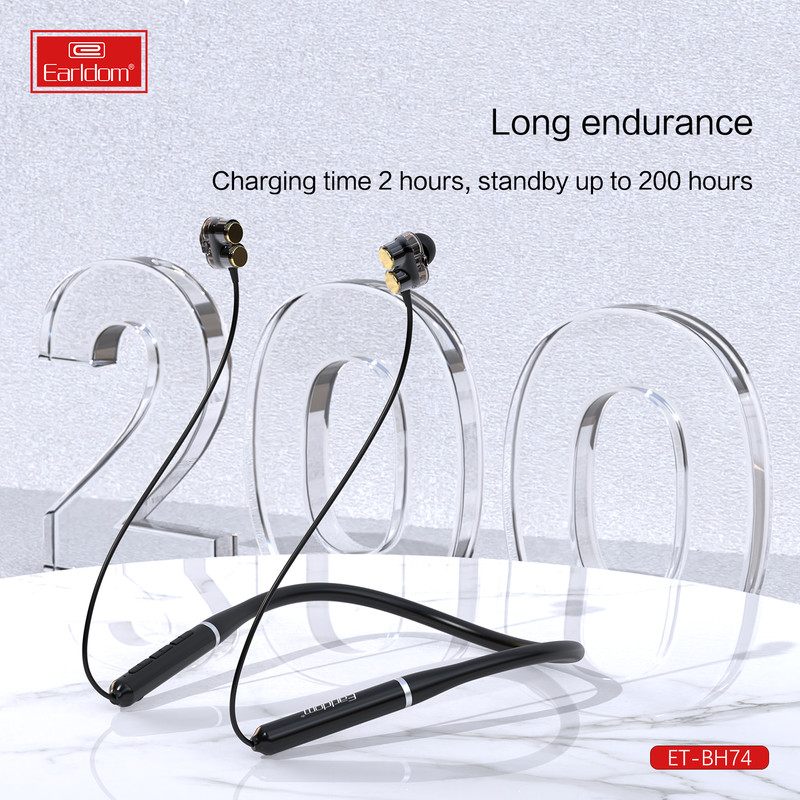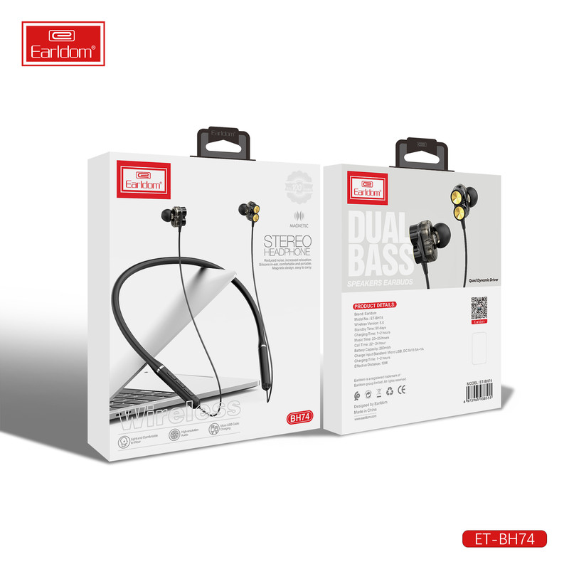 هندزفری های دورگردنی به دلیل راحتی در حمل و زیبایی، محبوبیت بسیاری در سرتاسر دنیا پیدا کرده اند، از این رو کمپانی ارلدام نیز از رقبا عقب نمانده و هندزفری بلوتوثی دورگردنی خود را با عنوان earldom BH74 عرضه کرد. این هندزفری از طریق بلوتوث نسخه 5 به تلفن همراهتان متصل شده و تا برد 10 متر اتصالی بدون نویز و قطعی را برایتان تضمین می کند. قسمت روی گردنی این هندزفری سیلیکونی می باشد و کاملا قابل انعطاف هست و همچنین وجود 4 عدد بلندگو ( در هر سمت 2 عدد ) باعث می شود که هندزفری یکی از حرفه ای ترین هندزفری های بازار برای گوش دادن به موسیقی تبدیل شود ،بر روی این هندرفری کلید های مدیریتی تعبیه شده که به وسیله آن می توان فعالیت های در حال انجام مانند مدیریت تماس، مدیریت موسیقی، کم و زیاد کردن صدا و فراخوانی دستیارهای صوتی اپل یا گوگل را کنترل کرد. میکروفون تعبیه شده در BH74 می تواند صدای کاربر را با کیفیت HD منتقل کند.باتری تعبیه شده در BH74 نیز توسط یک کابل Micro USB در مدت زمان 1 الی 2 ساعت به صورت کامل شارژ می شود و پس از آن به طور تقریبی می تواند حدود 22 الی 24 ساعت به پخش موسیقی یا مکالمه بپردازد . از آن جایی که هندزفری های پشت گردنی محبوبیت بسیاری بین ورزشکاران پیدا کرده ، این هندزفری طوری طراحی شده تا در برابر رطوبت و عرق کردن کاملا مقاوم باشد .