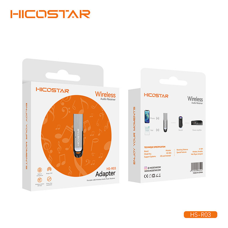 دانگل و گیرنده صدا بلوتوث هایکواستار HS-R03 یک رسیور و فلش بلوتوثی از شرکت HICOSTAR است که با اتصال آن به ضبط ماشین میتوانید با استفاده از بلوتوث دستگاه های مختلف مانند گوشی و تبلت را به آن متصل کرده و از موسیقی و امکانات دیگر استفاده نمایید و یا حتی میتوانید این گیرنده بلوتوثی هایکواستار HS-R03 را به اسپیکر نیز متصل کرده و با گوشی به پخش موسیقی بپردازید. گیرنده بلوتوث HICOSTAR HS-R03 دارای یک میکروفون داخلی درون بدنه خود است که به شما اجازه مکالمه از طریق این گیرنده و بدون نیاز به قطع اتصال گوشی شما را می دهد. این میکروفون می تواند در زمان رانندگی بسیار کارآمد و مفید باشد. با استفاده از این میکروفون شما بدون نیاز به توقف ماشین یا استفاده از موبایل خود می توانید به مکالمات خود بپردازید.دانگل بلوتوث هایکواستار HS-R03 سازگار با گوشی ها و تبلت های سامسونگ ، هواوی ، اپل و …. و دارای محدوده عمکلرد بلوتوث حدود 10 متری می باشد.قبلا برای پخش شدن موزیک سیستم ماشین از سی دی استفاده میشد رفته رفته از فلش و یا کابل AUX که پخش موزیک با AUX به دلیل وصل شدن گوشی به کابل دشوار است از این رو داشتن یک گیرنده بلوتوث که هیچ محدودیتی برای استفاده از موبایل ندارد لازم است. گیرنده بلوتوث هایکواستار با قابلیت پخش موزیک با کیفیت و قابلیت مکالمه بسیار کاربردی و طرفداران زیادی دارد.